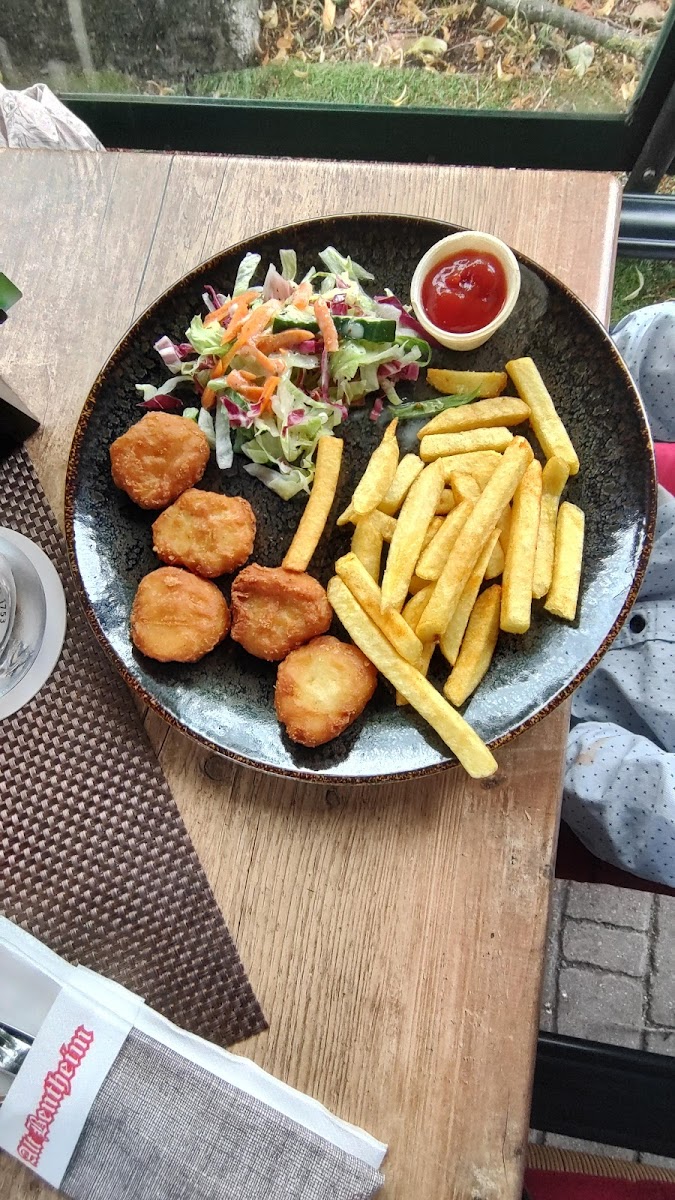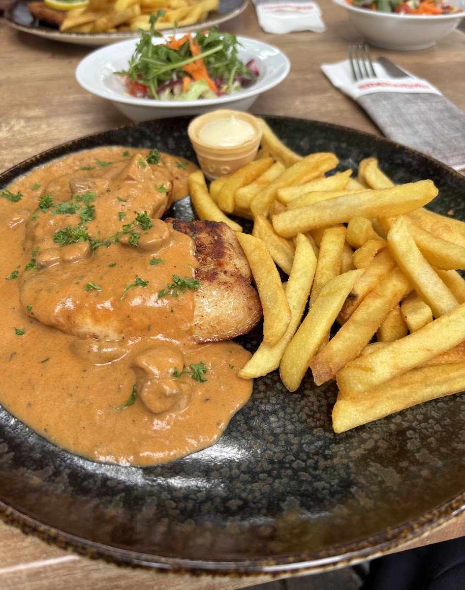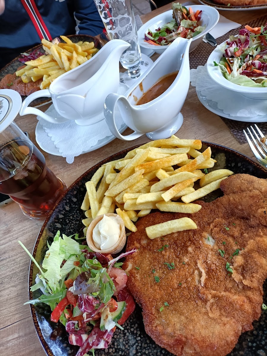 We had a dinner here as a family. Parking was easy; in front of the restaurant you can park for 1,5h before 18.00h, after that it is free. Staff was friendly and got the dishes to us quick. It is simple honest food and precisely what one would expect from a German Gasthof. Big portions! Normally we always get a starter and desert, this place only mains will do! Tip; the schnitzels are great! And those are mostly under € 25 so great value for money! We ate inside but they do have a big terrace as well!